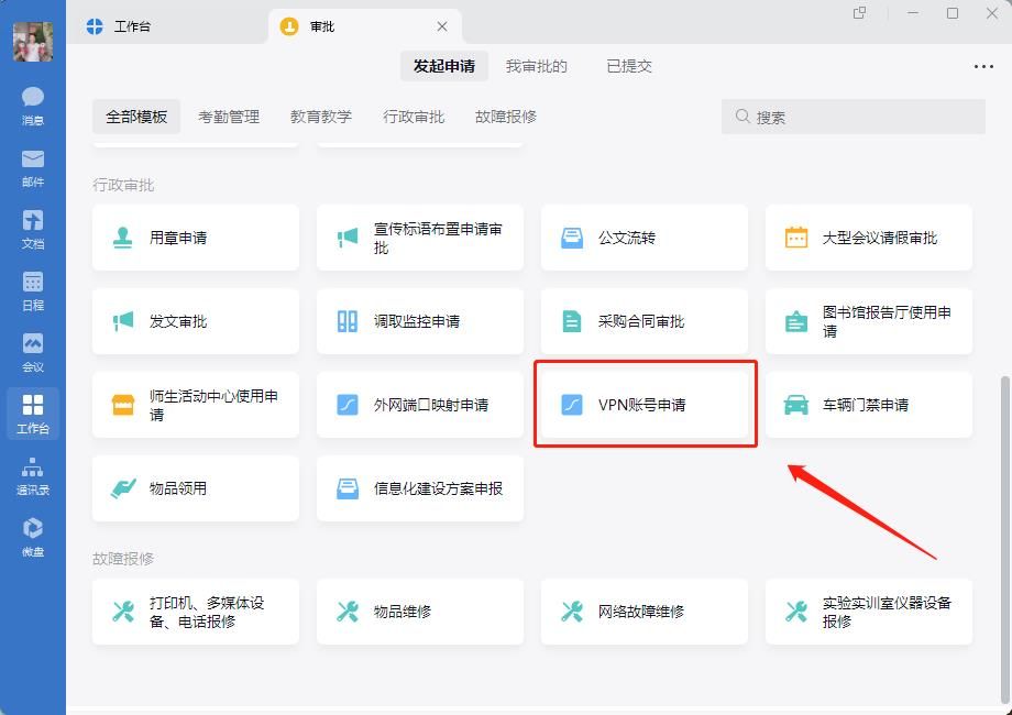 1、需要在企业微信工作台,点击—审批—VPN账号申请,审批通过后会分配账号和密码。