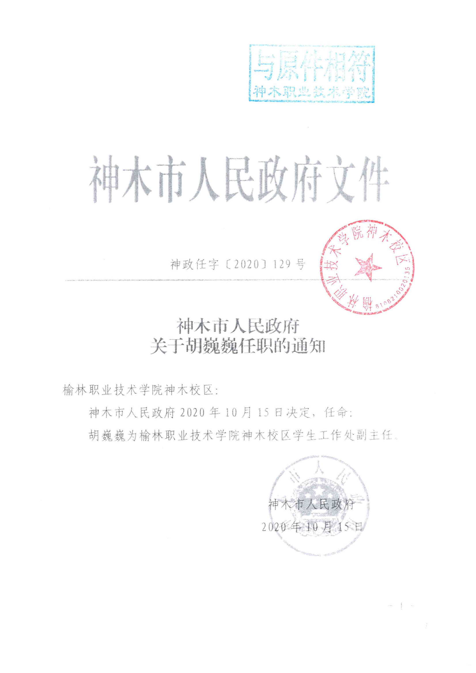 神木市人民政府关于胡巍巍任职的通知