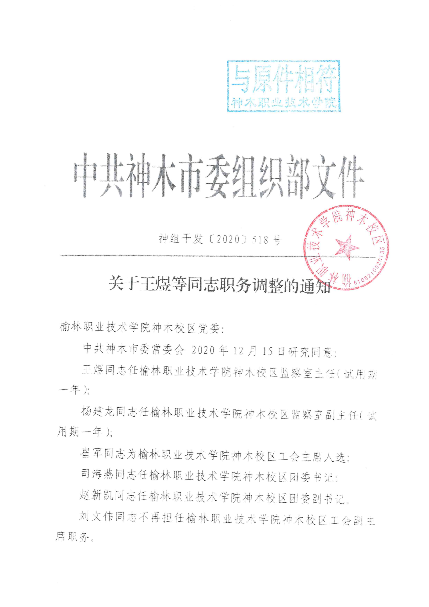 中共神木市委组织部关于王煜等同志职务调整的通知