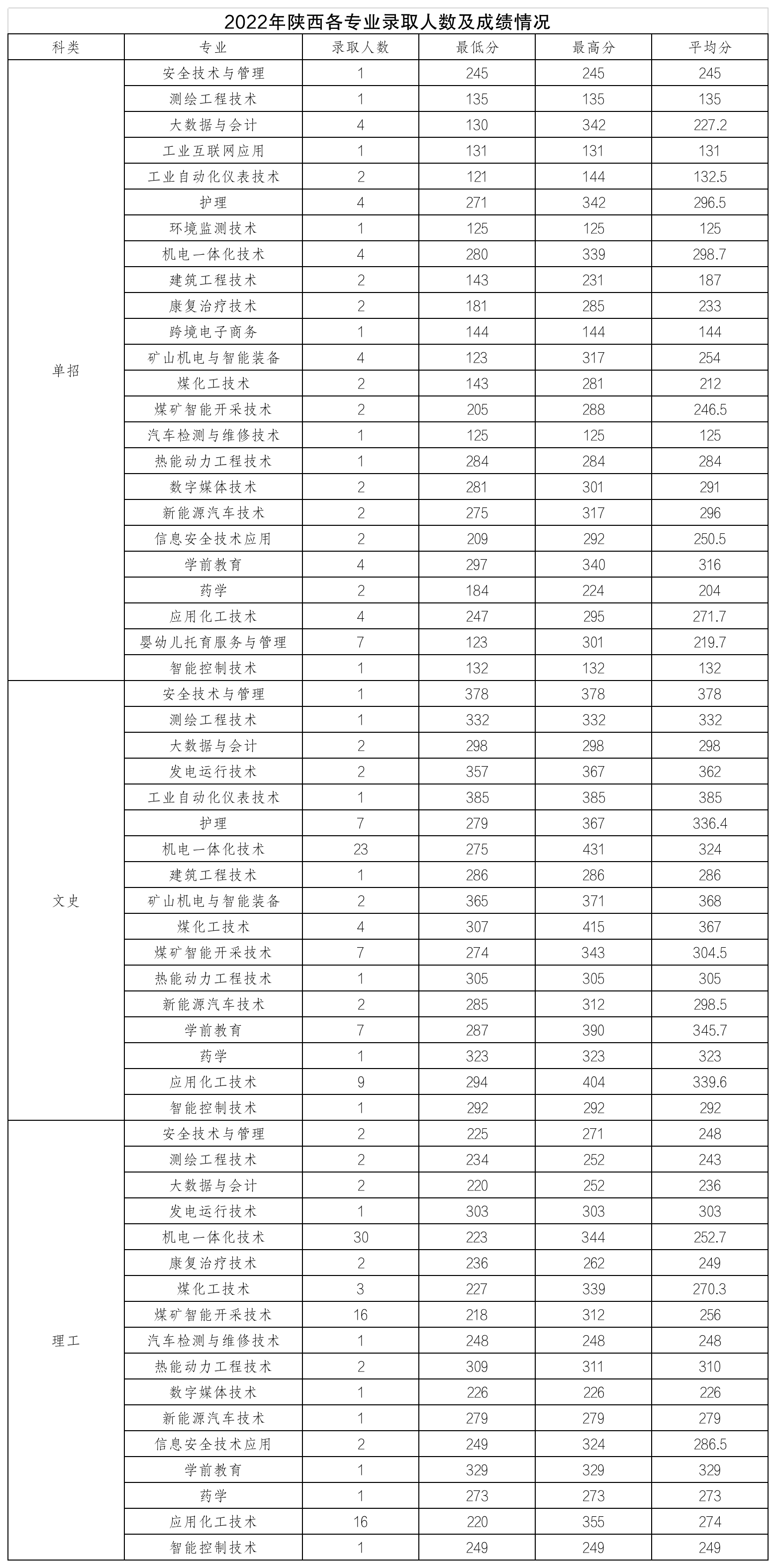 陕西2022年各专业高考录取人数及分数